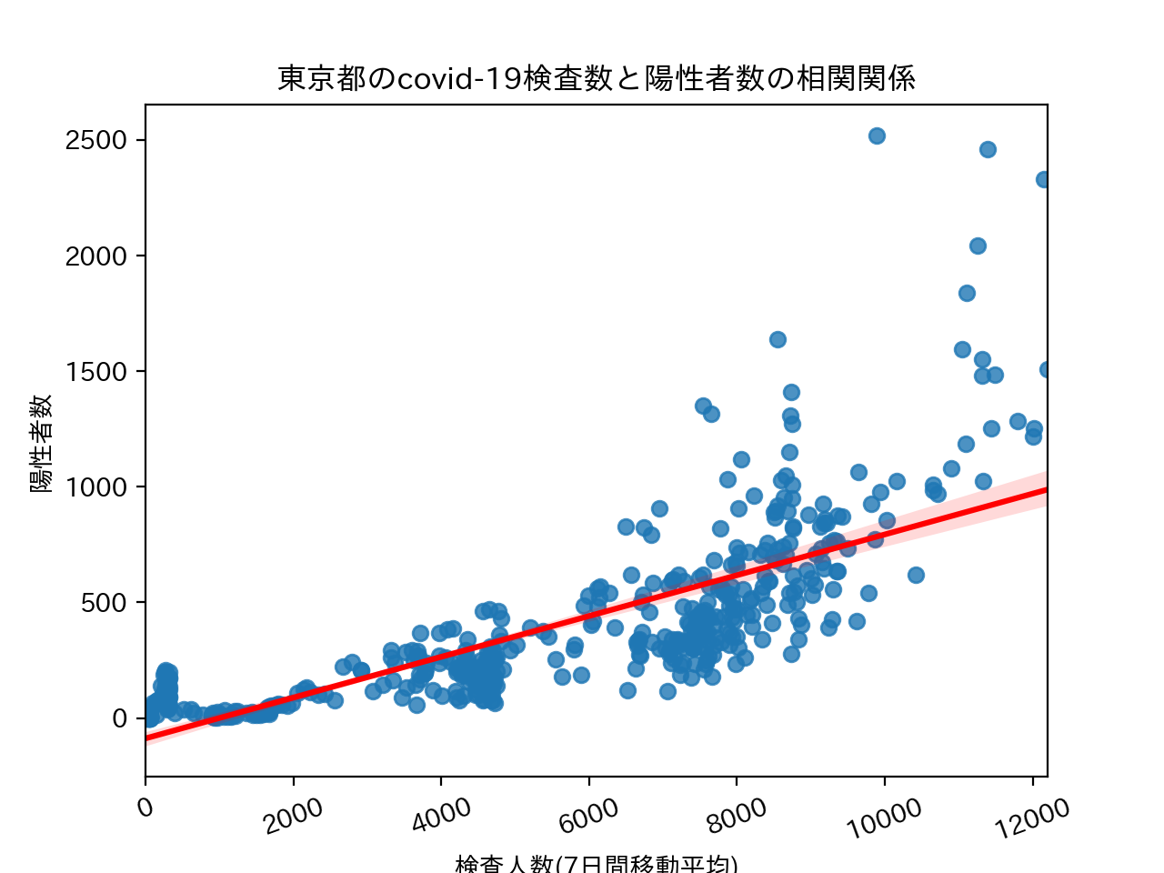 と、ただ、データをグラフにするだけではデータ分析とは言えないので、「陽性者数が少なくなるのは検査数が少なくなってるだけちゃうんかい疑惑」を検証するために、検査数と陽性者数を回帰分析して散布図を作るようにもしてみた。